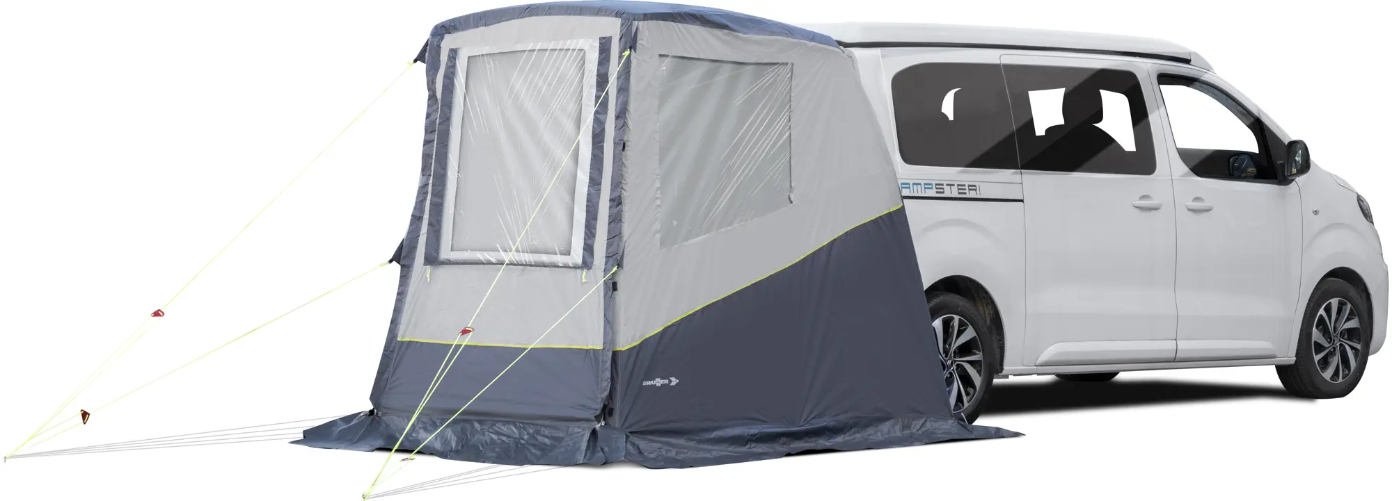 The Brunner Escape is a frameless tailgate tent designed specifically for Peugeot Traveller, Citroën Spacetourer and Toyota Proace vehicles. Installation takes minutes without any tools needed. The tent roof places directly over your open tailgate, while the flysheet tensions to the ground using replaceable guy ropes and 30cm plastic pegs. This 150D Oxford polyester construction provides a waterproof 3000mm hydrostatic head rating, giving you a sheltered 160cm wide x 210cm deep x 195cm high space at the rear of your van. Weighing 4.88kg with a pack size of 64 x 18cm, it fits neatly in the included compression bag when not in use.