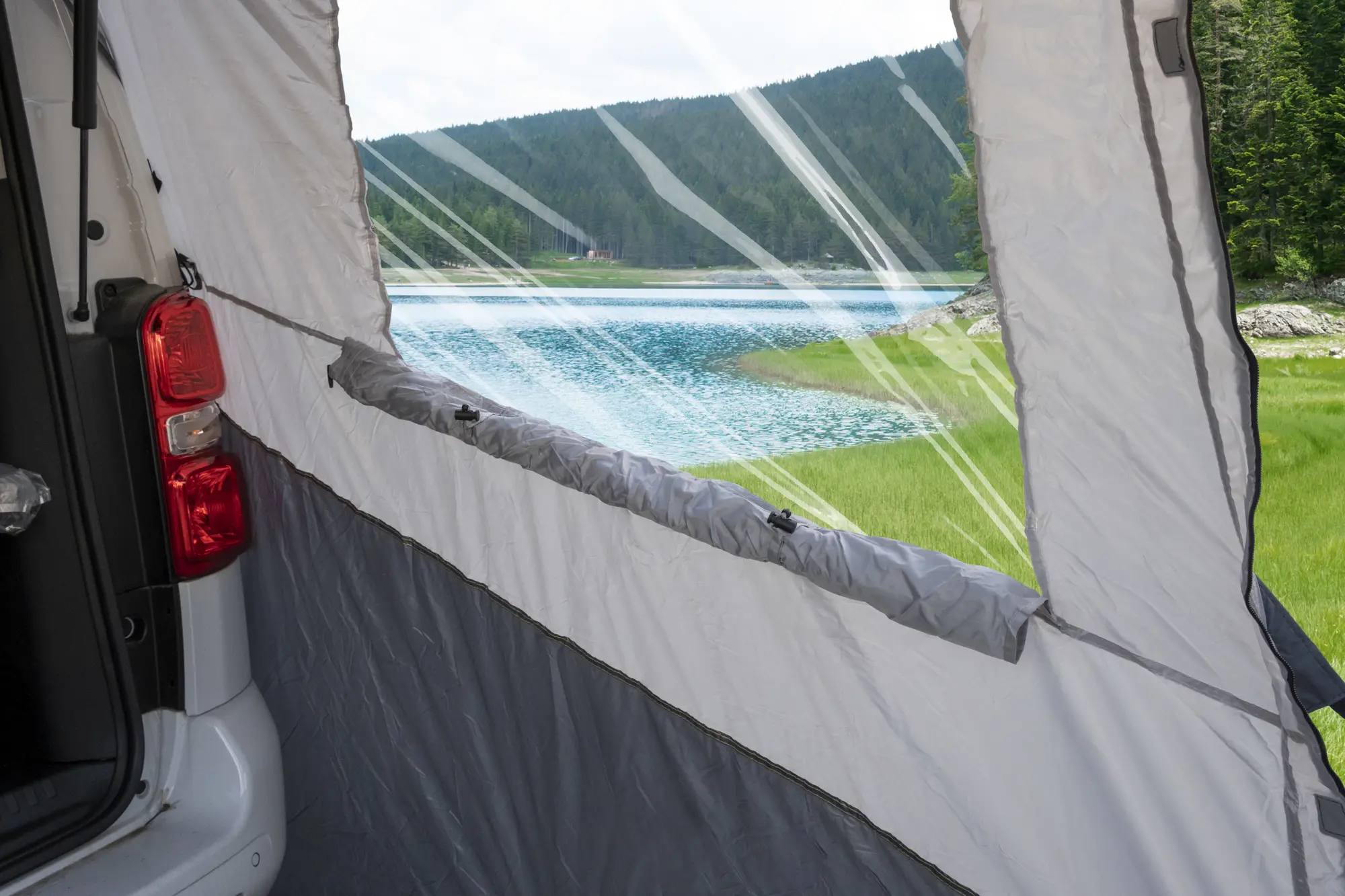 The front wall rolls up completely for full access or extends outwards as a sun canopy using two upright poles included with the tent. This creates additional sheltered space outside your vehicle for cooking, dining or relaxing. A large mesh window in the front panel provides ventilation when closed, whilst tinted film offers weather protection and privacy. Internal blackout panels block light when needed. The front wall design gives you flexibility to adapt the tent configuration to different weather conditions.