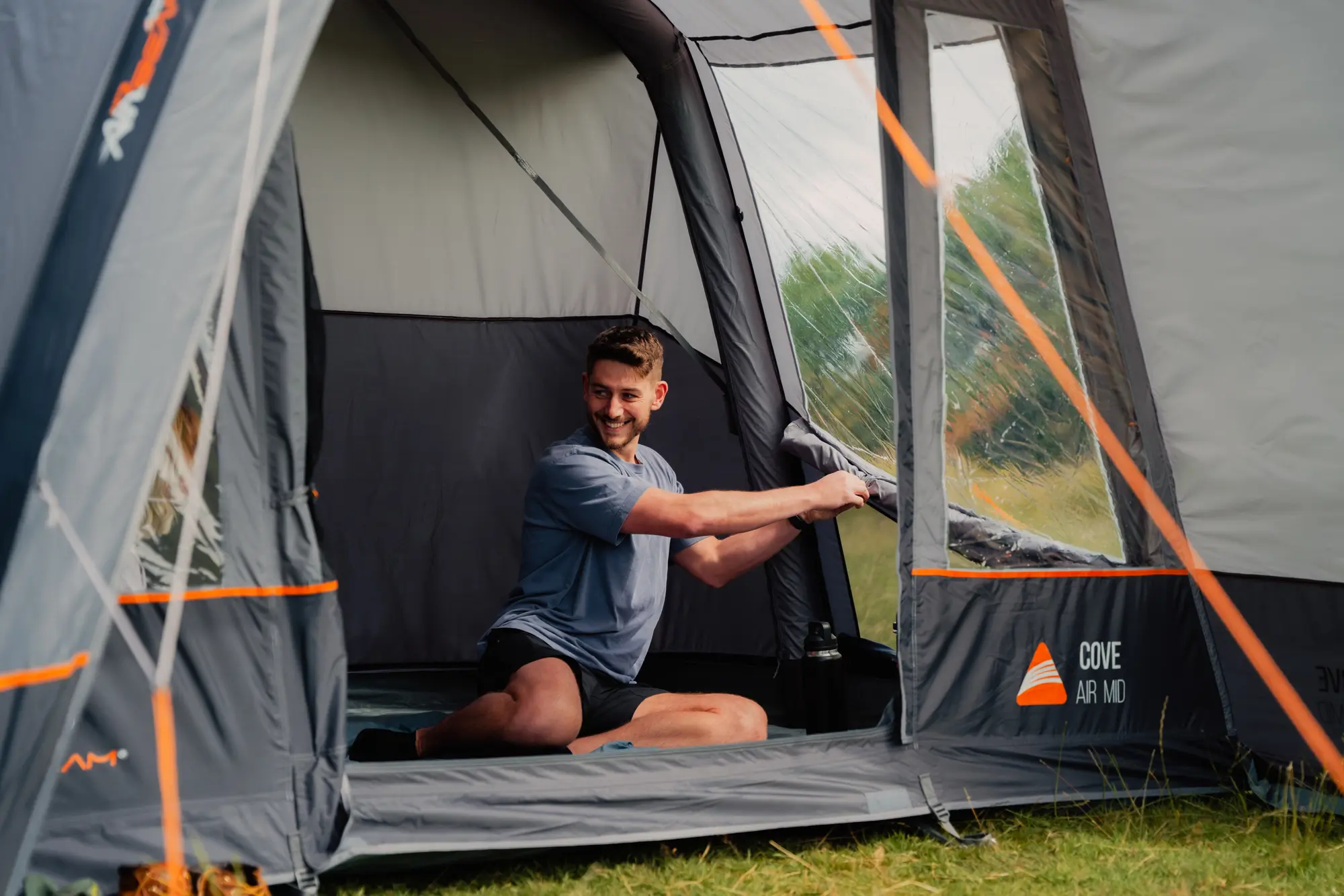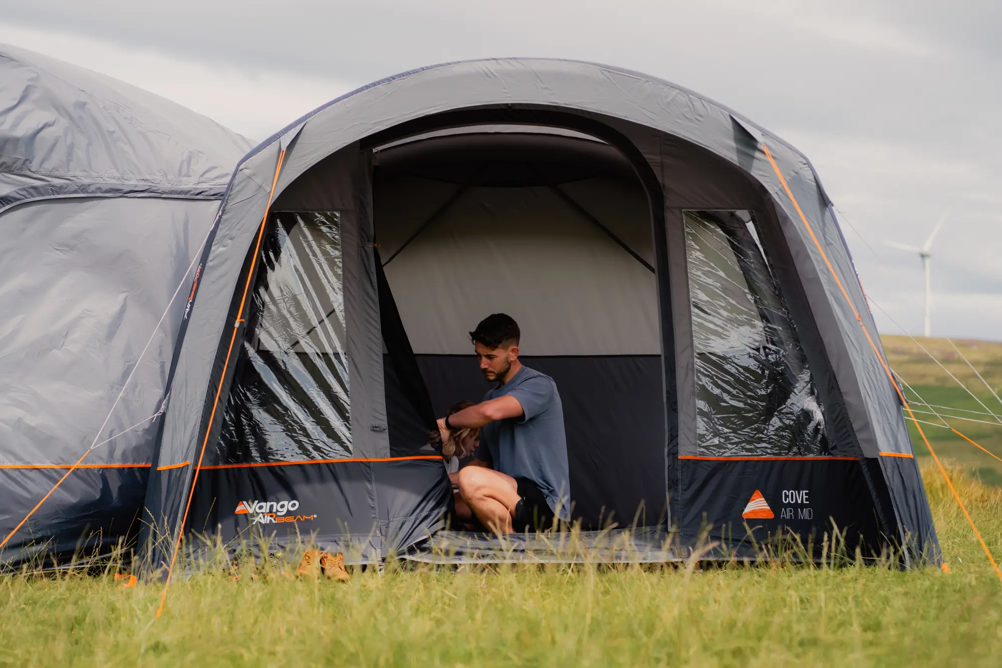 The Cove III can be pitched in approximately 10 minutes. It includes three individual inflation points and comes with a Vango specialised hand pump. An electric pump is also available but not necessary due to the ease of manual inflation.