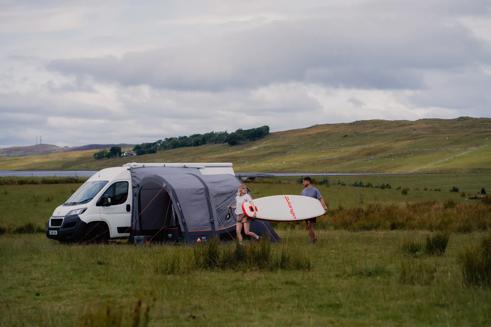 The Vango Cove III Air Driveaway Awning (2025) is available in both Low and Mid Heights. It embodies the essence of outdoor versatility and practicality making this awning meet the diverse needs of caravanners and motorhome enthusiasts. Its dimensions are meticulously designed to provide substantial storage space, an area for social gatherings, or an extra sleeping quarter, making it a an important addition to any outdoor adventure. The pre-attached front canopy, a notable feature, transforms into an enchanting outdoor seating area, perfect for basking in scenic views.
