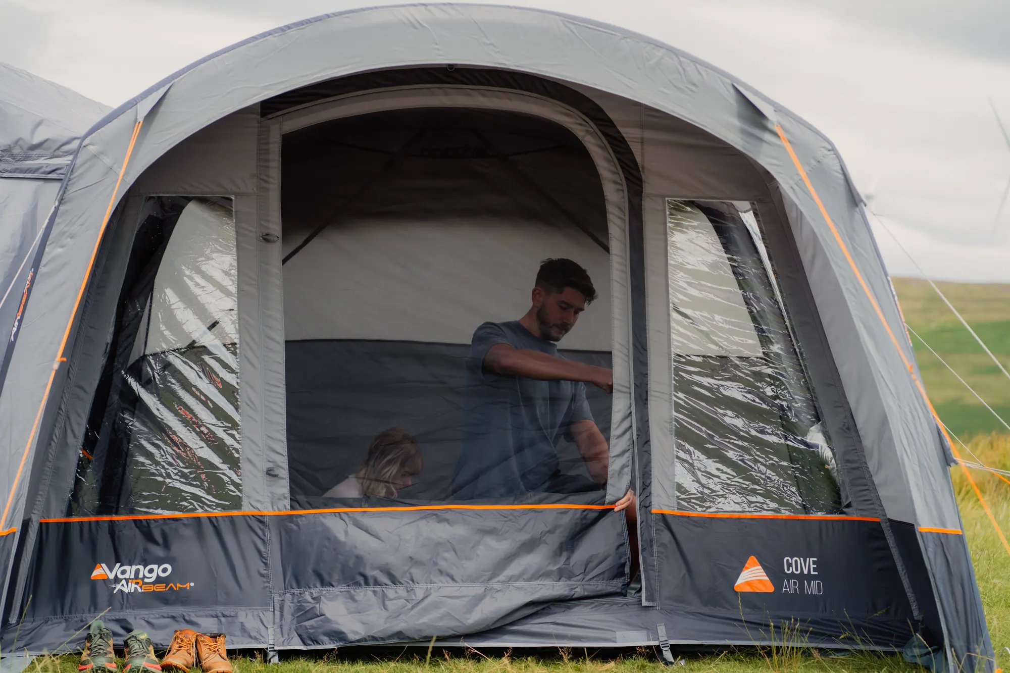 Accessibility and privacy are key aspects of the Vango Cove III Air Driveaway Awning (2025). The awning features two doors in the tunnel attachment to the vehicle, allowing easy access to both the front and rear of the vehicle. The covered entry is ingeniously designed to prevent rain from entering the living area, ensuring a dry and comfortable interior. For moments requiring privacy, the awning includes toggled privacy curtains that can be effortlessly rolled away when not in use.