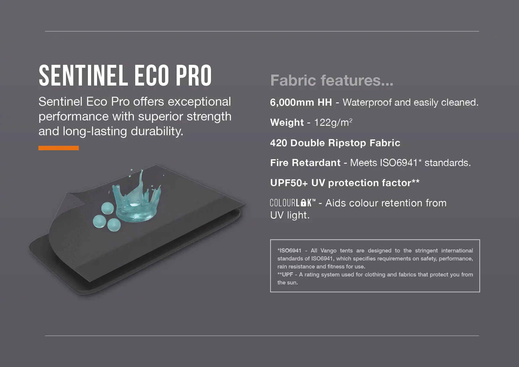 The Kela Pro uses Vango's Sentinel Eco Pro fabric, made from recycled plastic bottles. This innovative process transforms plastic waste into durable, high-specification fabric, contributing to environmental sustainability.