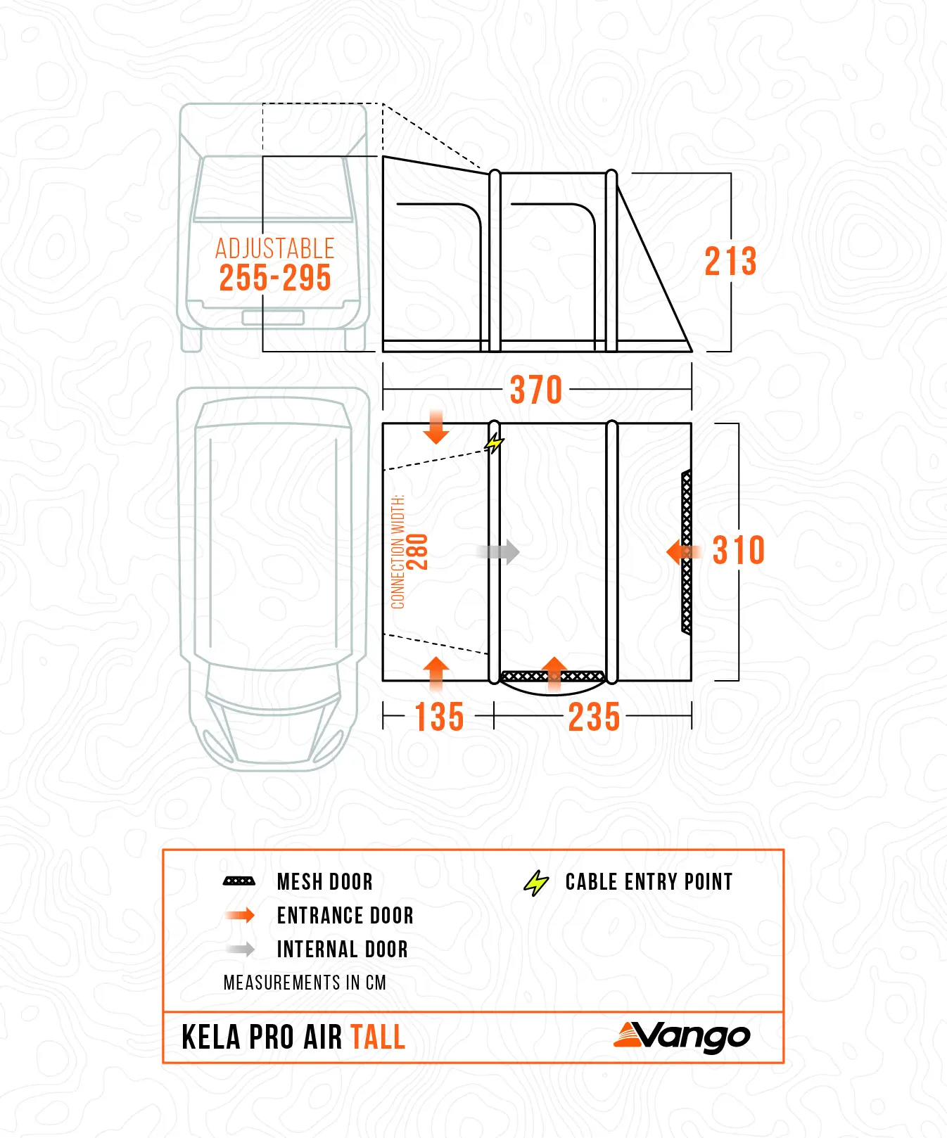 The Vango Kela Pro Air Tall Driveaway Awning comes with the SkyTrack® II system, allowing you to personalise your space with ease. Hang up lights, storage, or even SkyLiners with the included pack of 10 Sky Hooks. You can also say goodbye to pesky bugs thanks to the Secondary Mesh Doors, which offer great ventilation while keeping insects out. Cable Entry Points make it convenient for you to power all your essential camping gadgets, making sure you're never out of juice.