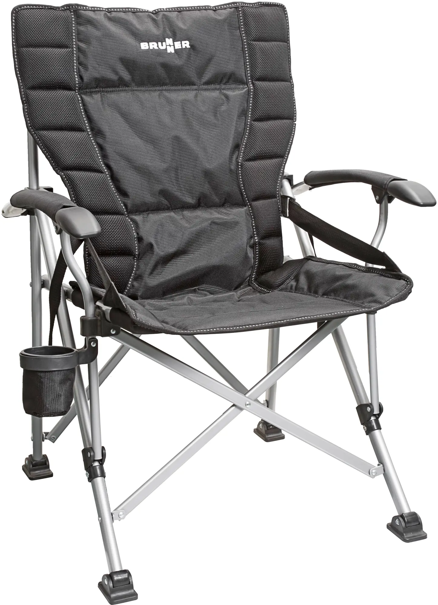 Standard camping chairs typically measure 85-95 cm in height, leaving taller users sitting with less-than-ideal posture. The Brunner Raptor XL addresses this with its 110 cm overall height and properly proportioned seat dimensions of 65 x 63 cm, providing adequate leg room and back support. At 6 kg with a 150 kg weight capacity, it balances robust construction with reasonable portability for caravan and motorhome use.