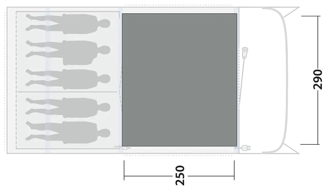 This carpet is cut specifically for the Florida 5 Air tent's 250 x 290 cm floor dimensions. Whilst the carpet might physically fit inside other similarly-sized Outwell tents, the corner attachment points won't align properly with different tent models. Each Outwell tent has its own dedicated carpet design to ensure proper fit and attachment. Using a carpet designed for another tent model will result in gaps or overlaps.