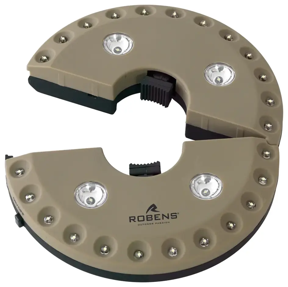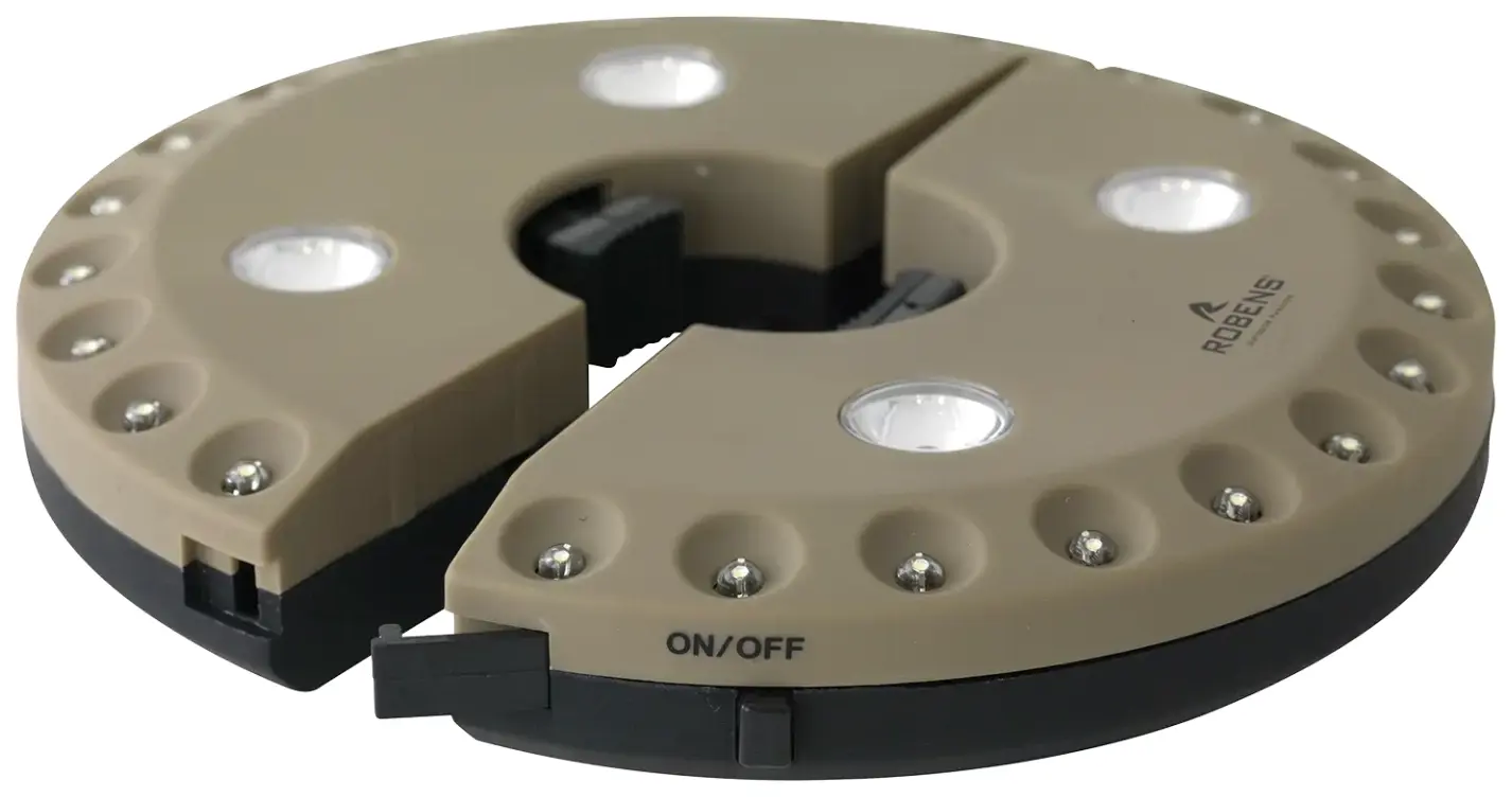 You get four lighting modes controlled by a single push button. The inner circle LEDs provide focused downward light for tasks like cooking or reading maps. The outer circle LEDs offer softer ambient lighting that bounces off the tent walls. Run both circles together for maximum brightness, or switch to the dimmed mode when you want subdued lighting before sleep. The expandable centre grips different pole diameters securely - particularly useful if you own multiple tipis or plan to use it across different brands.