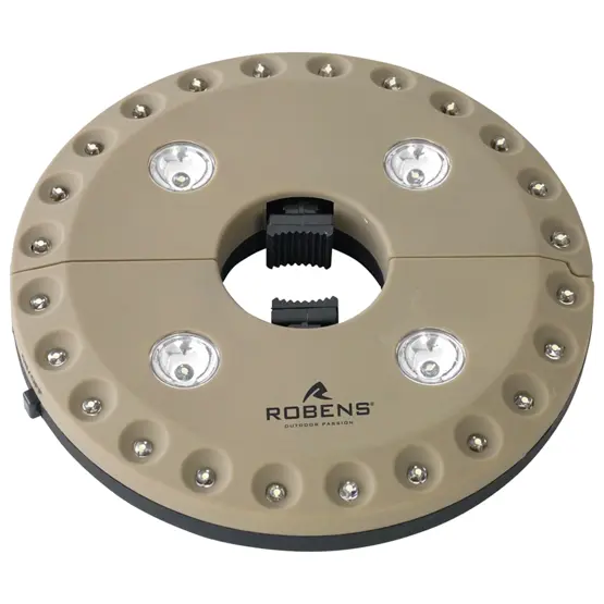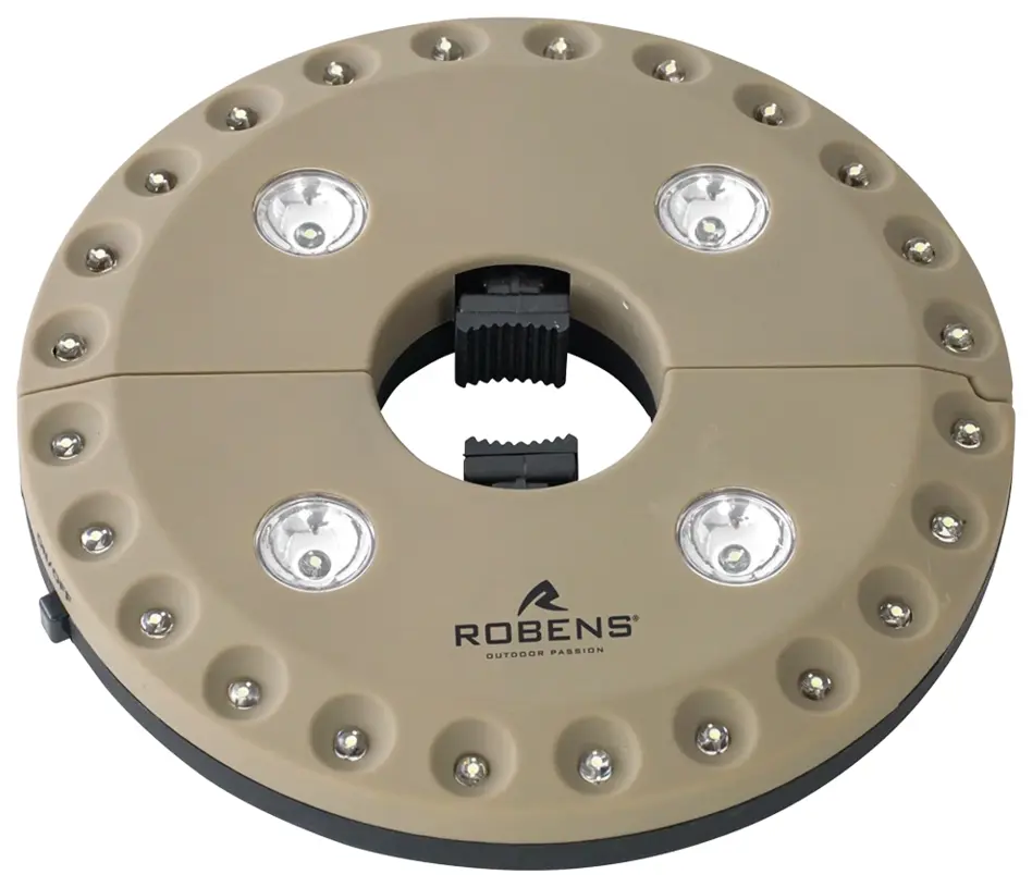 The Robens Thacla Tipi Lamp solves a specific problem for tipi tent owners - how to get proper overhead lighting without hanging torches or mess around with complicated setups. This 100-lumen lamp clamps directly around your central pole, spreading light in a full 360-degree circle from its dual LED rings. The khaki ABS housing weighs just 168 grams and measures 16cm diameter by 3cm height, so it won't strain lighter poles or take up meaningful headroom.