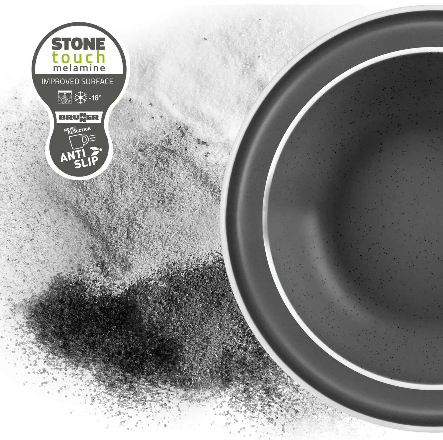 The Brunner Dolomit Grey Melamine Set is a 12-piece dinnerware collection designed specifically for caravanning, motorhome travel and outdoor living. Made from StoneTouch melamine, a melamine-mineral blend, this set delivers the appearance and feel of porcelain whilst remaining lightweight and break-resistant. The set includes four dinner plates at 25 cm in diameter, four dessert plates at 20 cm, and four bowls at 16 cm. Each piece features an integrated rubber ring on the base that prevents slipping on tables and dramatically reduces the rattling noise during travel. The grey Dolomit finish complements modern caravan interiors and provides a sophisticated alternative to traditional camping tableware.