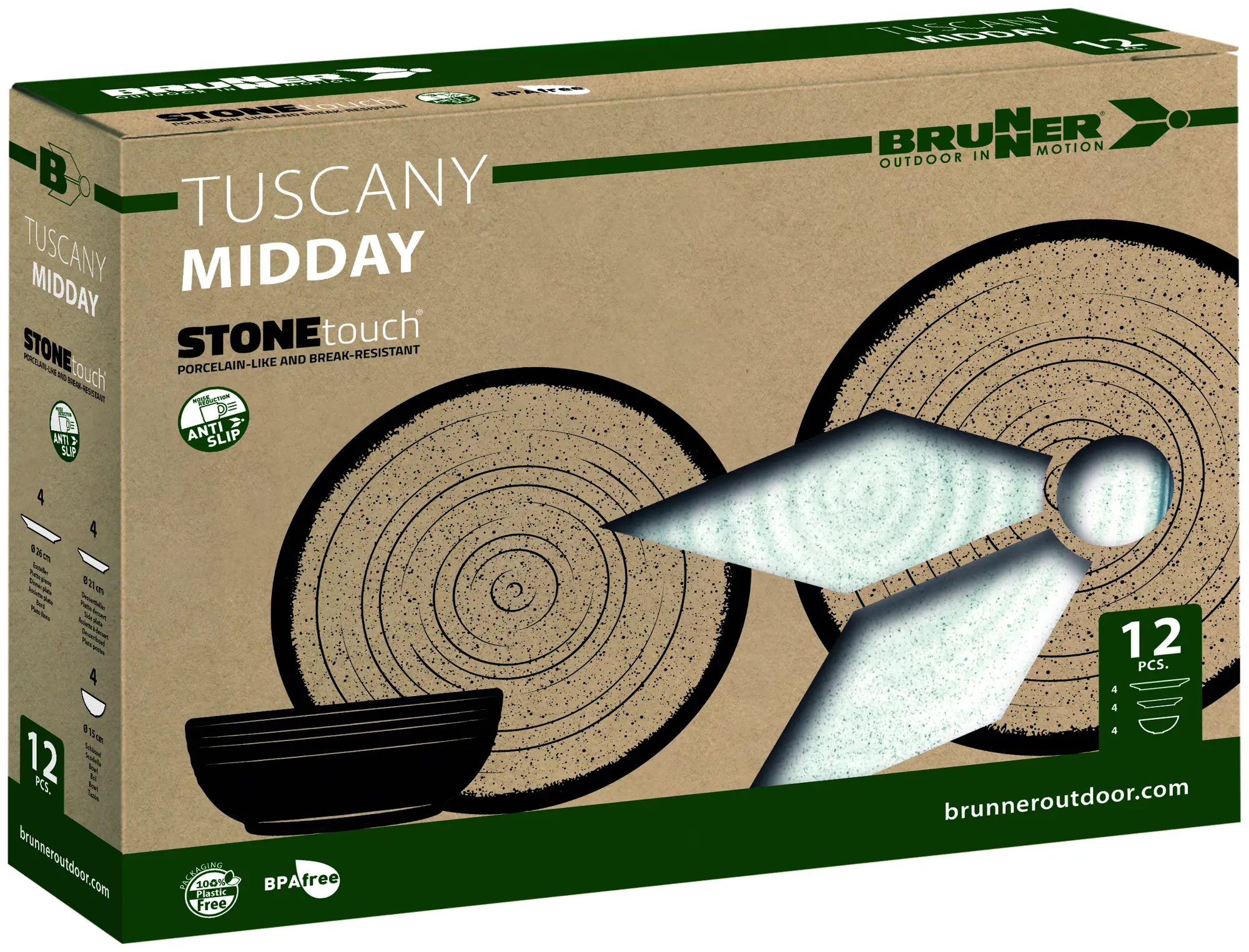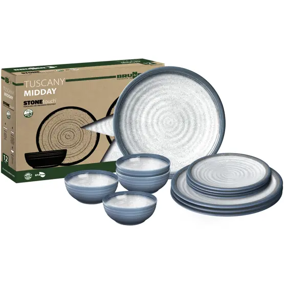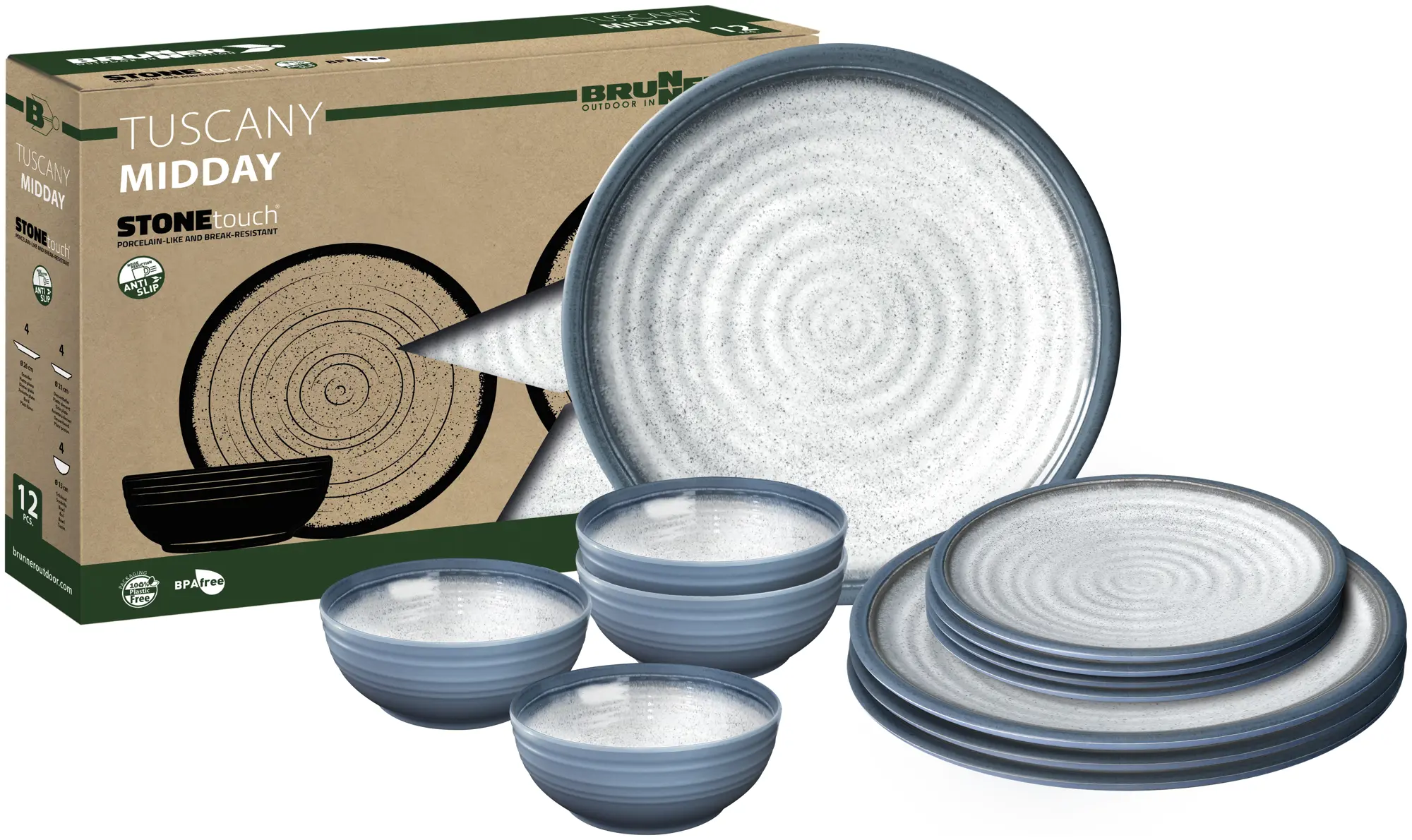 The Brunner Midday Tuscany 12-Piece Melamine Set offers caravan and motorhome owners a practical alternative to ceramic tableware without sacrificing style. This set includes four dinner plates (26cm), four dessert plates (21cm), and four bowls (15cm), providing complete dining solutions for families or couples travelling in campervans, caravans, or staying at campsites. The StoneTouch melamine and mineral composite construction delivers a porcelain-like appearance whilst remaining lightweight and resistant to breakage, perfect for outdoor use and transit.