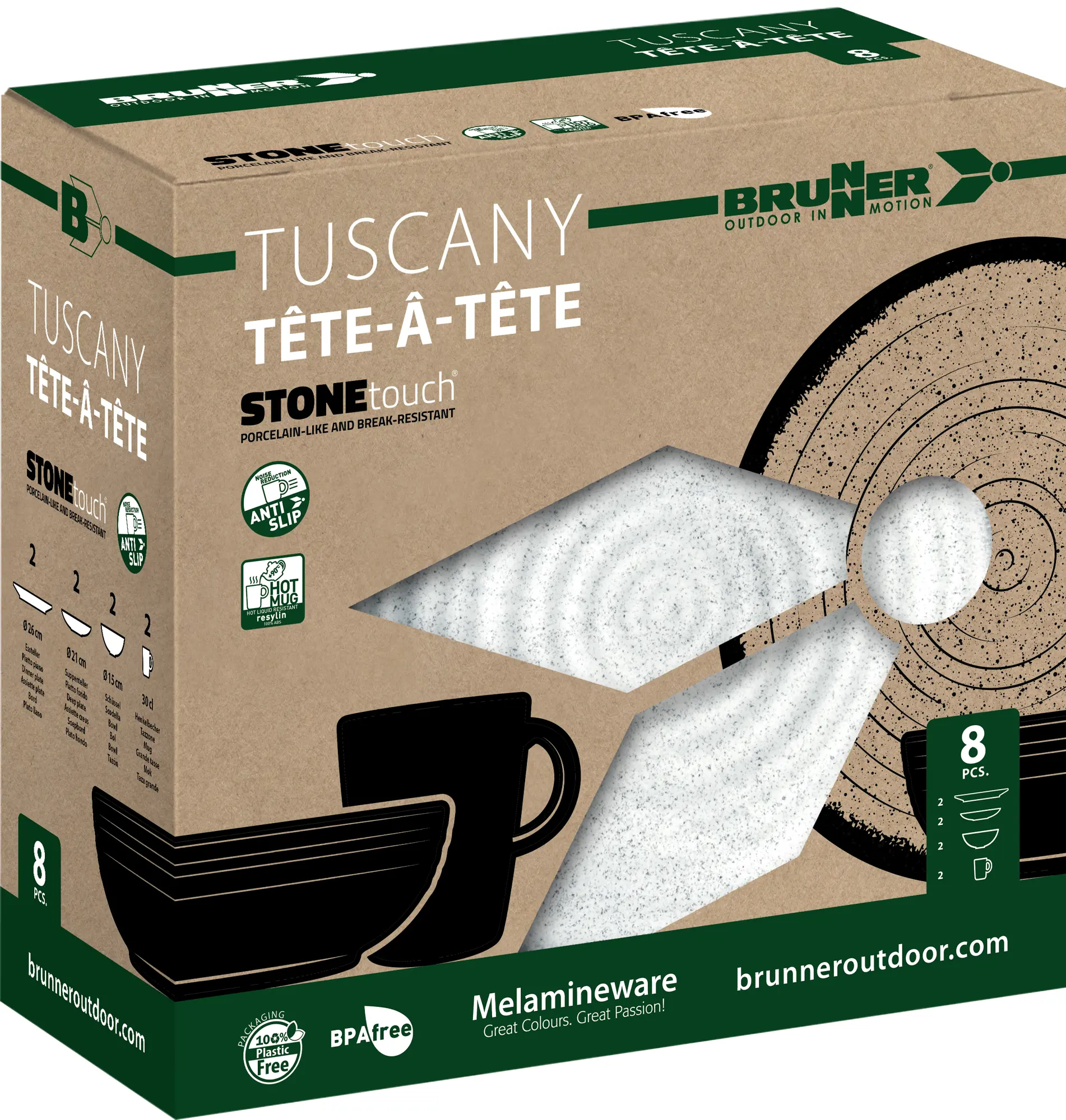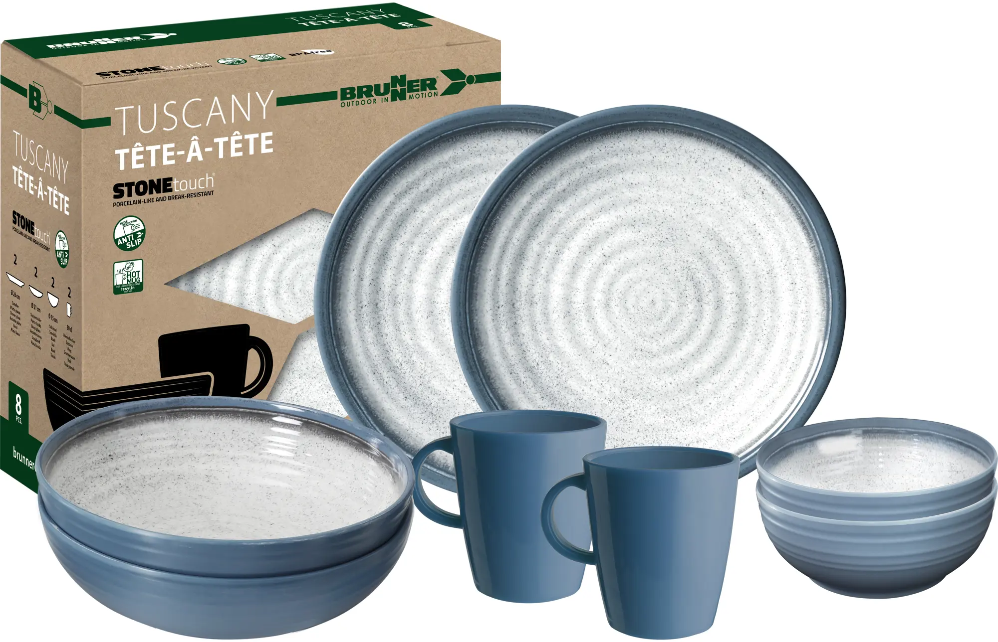 The Brunner Tête-â-tête Tuscany Melamine Set offers a practical solution for outdoor dining at campsites, caravan pitches, and motorhome trips. Manufactured from Stonetouch melamine, this 8-piece set includes two 26cm dinner plates, two 21cm deep plates, two 15cm bowls, and two 300ml mugs. The Tuscany design adds visual appeal to your table setting, whilst the break-resistant construction means you can enjoy worry-free dining at the campsite.