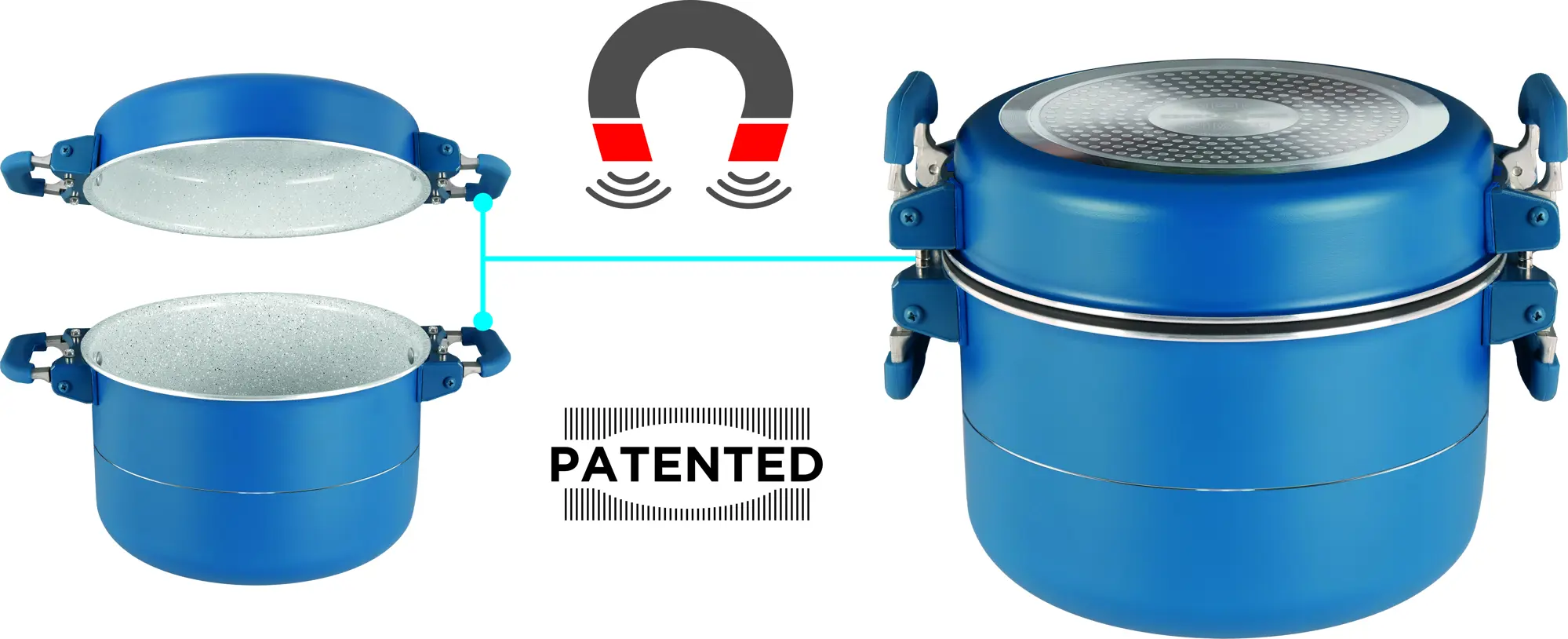 • Magnetogrip Handle System : Fold-down magnetic handles attach securely during cooking and fold flat for compact storage.