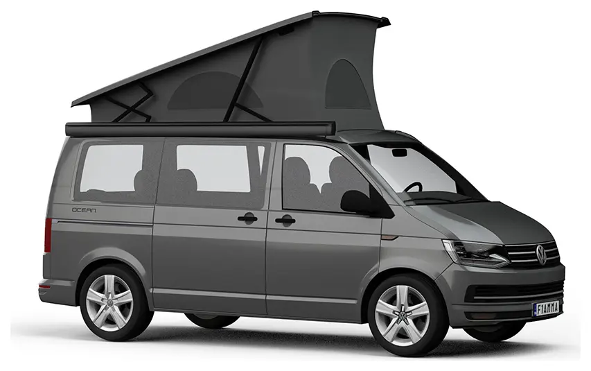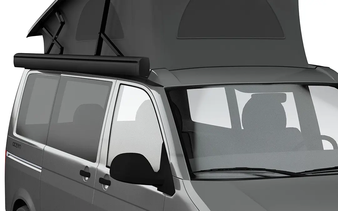 Yes, the F43van is specifically designed for campervans with pop-up roofs. The awning features lowered mounting brackets with reduced projection that sit low on the campervan, minimising the height added to your vehicle. This design allows you to fit under parking restriction barriers whilst still providing full 2.20m height underneath when extended. The compact dimensions and automotive-style finishing complement the shape and aesthetics of campervan conversions.