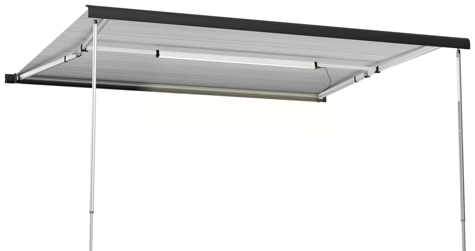 No, the Fiamma Rafter LED Van should be removed before retracting your awning. The LED strip attaches to the rafter arms that support the awning fabric, and these arms fold back into the awning cassette when you pack it away. You need to detach the LED strip and disconnect the power cable before rolling up the awning. The attachment system is designed for quick removal and reattachment, so this process takes less than a minute once you're familiar with it. Store the LED strip inside your motorhome during transit to protect it from road vibration and weather exposure.