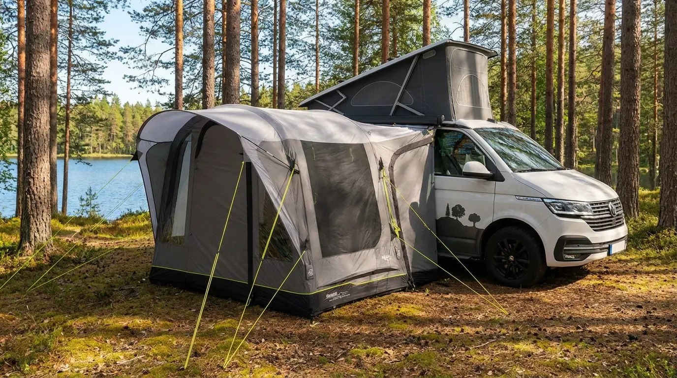 The Outwell Santa Monica Air is a drive-away awning designed for campervans and motorhomes with connection heights between 175-200cm. It uses an inflatable air tube system rather than traditional poles, which means you can pitch it in about 10 minutes using the included pump. The awning connects to your vehicle via a 250cm connection rail that accepts both 7mm and 5mm beading, then when you want to explore the area, you simply detach and leave it standing on your pitch. The living space measures comfortably for two to four people, with a sewn-in polyethylene groundsheet that keeps dampness out.