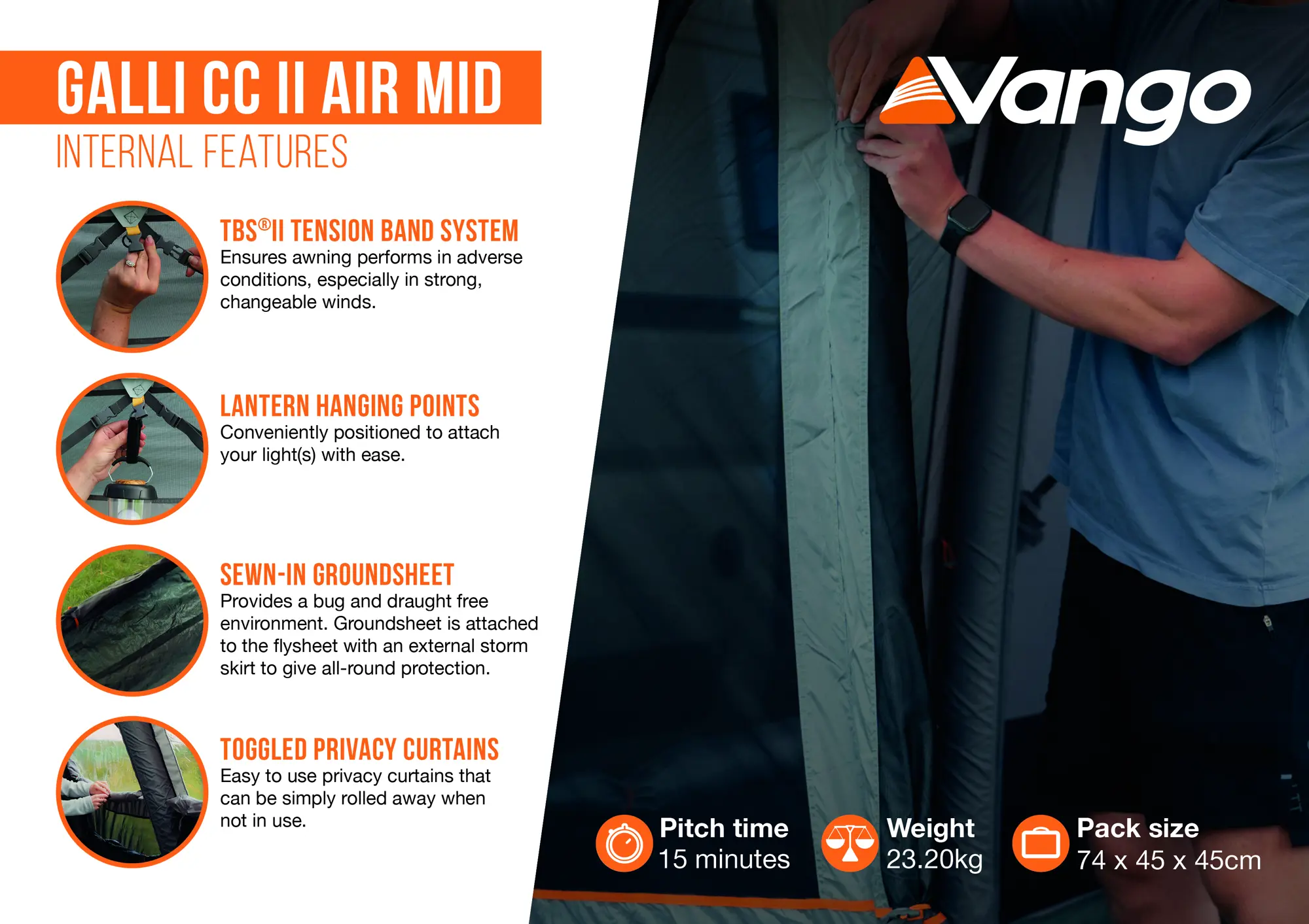 The Vango Galli CC II Air Driveaway Awning series is a perfect blend of innovation, comfort, and practicality. Whether you choose the Low, Mid, or Tall model, you're investing in a high quality product that will enhance your outdoor adventures, providing a secure, convenient, and welcoming space wherever you roam. With its quick setup, robust materials, and thoughtful features, it's more than just an awning, it's an essential part of your journey, promising countless enjoyable and comfortable outdoor experiences.