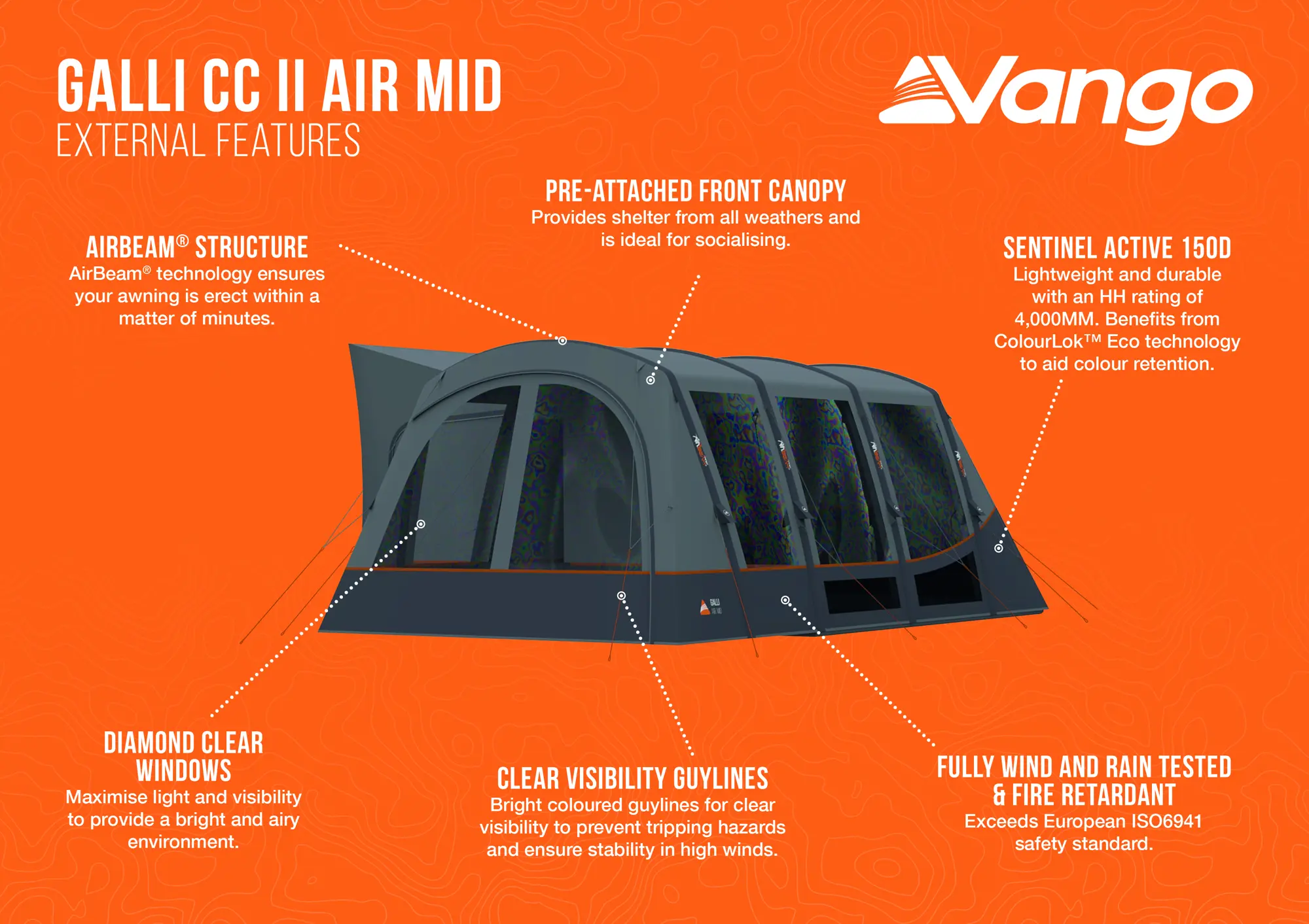 The Vango Galli CC II Air Driveaway Awning , encompassing the Low, Mid, and Tall models are designed to cater for different vehicle heights, ensuring a perfect fit and a seamless integration with your caravan or motorhome. The Galli CC II Air Driveaway Awning, with its ample space and pre-attached front canopy, offers an expansive area for family and friends to gather, dine, or relax and ensuring you get the privacy and protection from the elements. Utilising Vango's pioneering AirBeam technology and Sentinel Active 150D fabric, these awnings promise a rapid setup, lightweight handling, and robust weather resistance, making them an ideal asset for your travels.