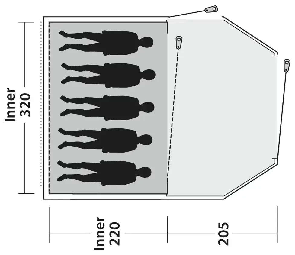 | Persons | 5 | Tent berth indicates how many people your tent can accommodate for sleeping. The industry standard allocates about 60cm of width per occupant, though exact dimensions can vary by manufacturer. If you prefer extra elbow room, you may want a tent berth larger than your headcount. Many campers size up by one or two berths to improve comfort on longer trips. |