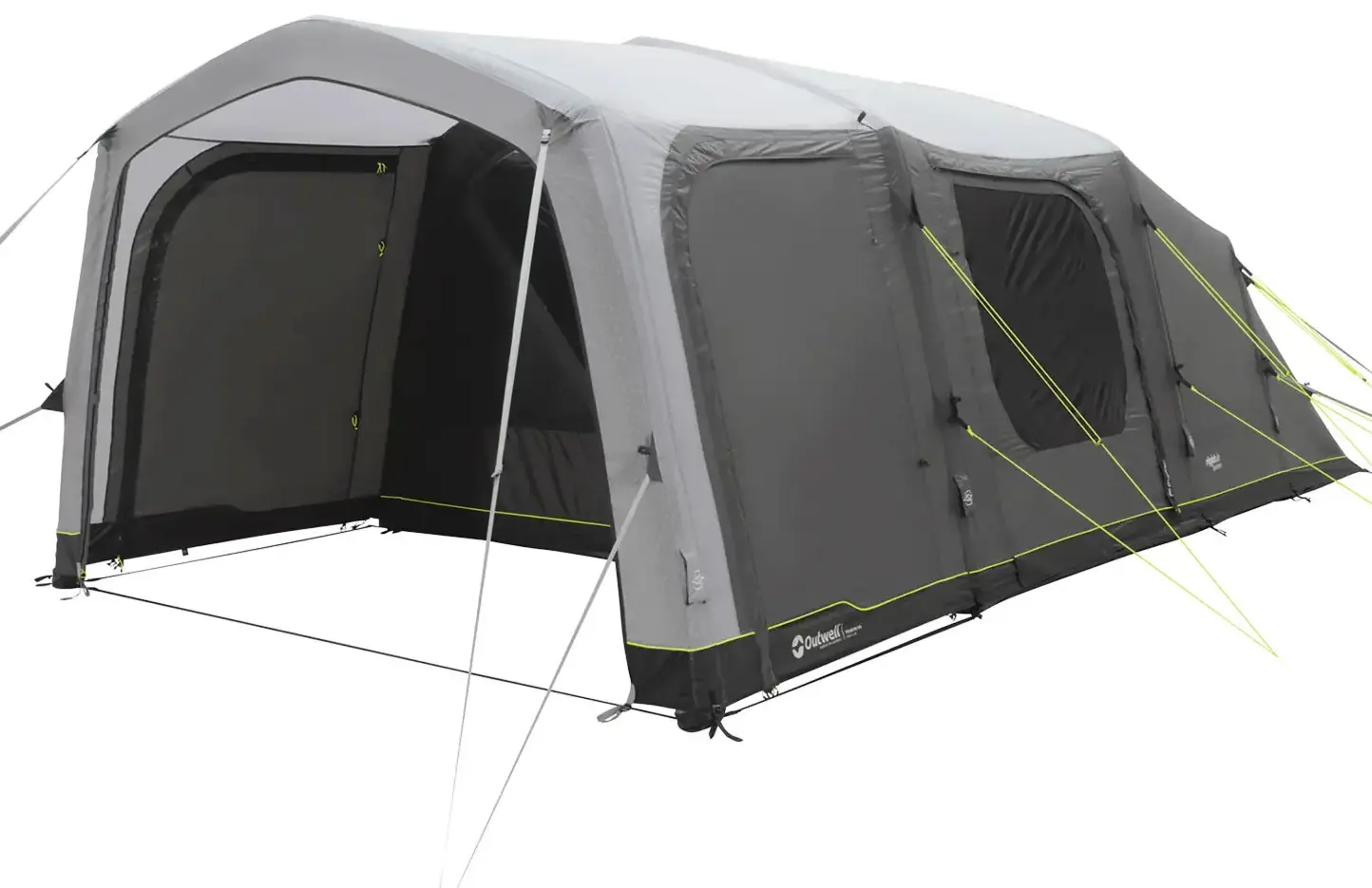 The Outwell Iowa 5 Air sits firmly in the tunnel tent category, offering sleeping space for up to five people across two separate bedrooms and a central living area. What makes this particular model interesting is its integrated patent-pending light system - a 200cm LED strip built directly into the tent structure that runs off any USB-C power source you bring along. The Outtex 6000 RS Express flysheet gives you a 6000mm hydrostatic head rating, while the DuraAir tubes replace traditional poles for a faster pitch. Outwell claims you can have this tent weather-ready in 10 minutes, fully complete with all the bits in 22 minutes. That's realistic if you've pitched it once before and know where everything goes.