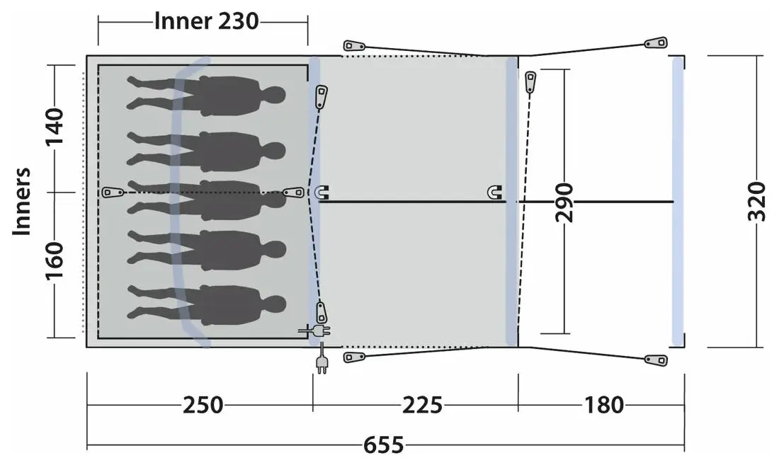 • Unique integrated patent-pending Outwell Light System provides elegant and effective lighting inside the tent. Powered by any USB-C power source (power source not included)