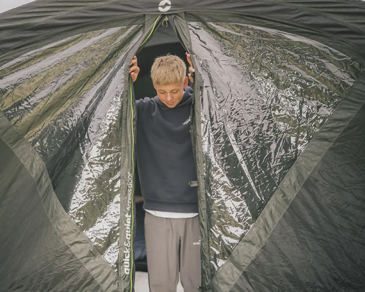 The tent provides extensive ventilation through multiple systems. The front canopy has doors on both sides that open completely for cross-ventilation, all backed with insect-proof mesh. Both bedrooms include mesh ventilation panels. The front wall combines mesh and PVC windows with separate curtains for individual control, allowing you to adjust airflow and privacy independently. There are also two extra-large side doors with mesh screen backing. This multi-point ventilation system is effective for maintaining airflow during warm weather whilst keeping insects out.