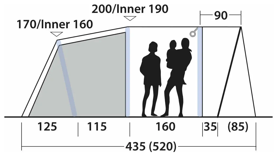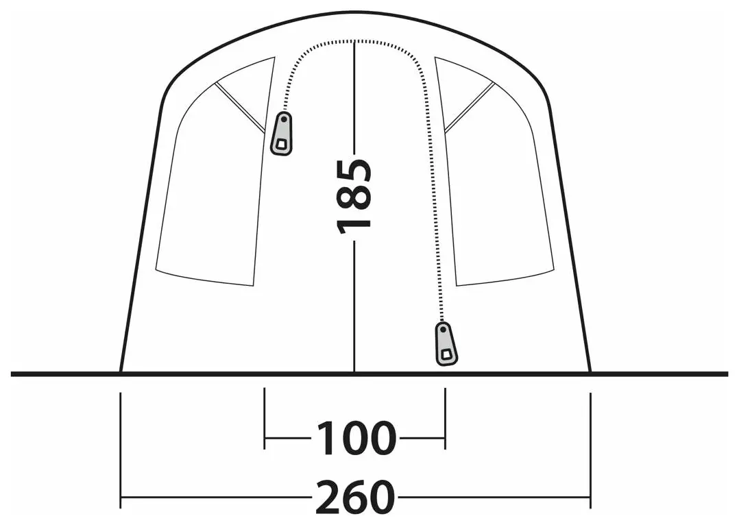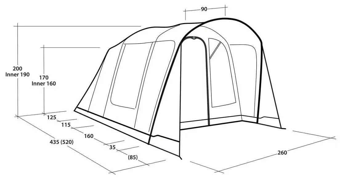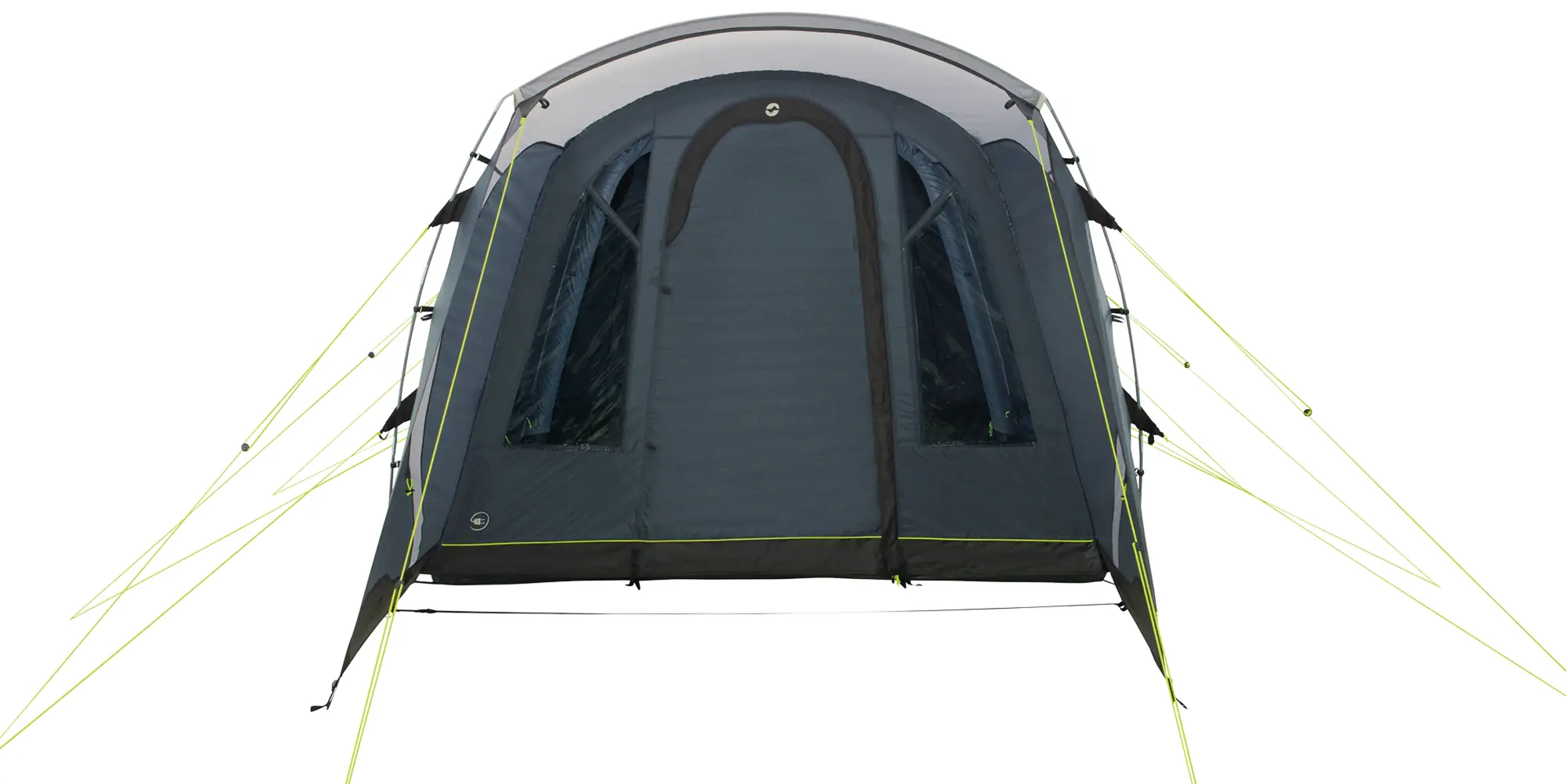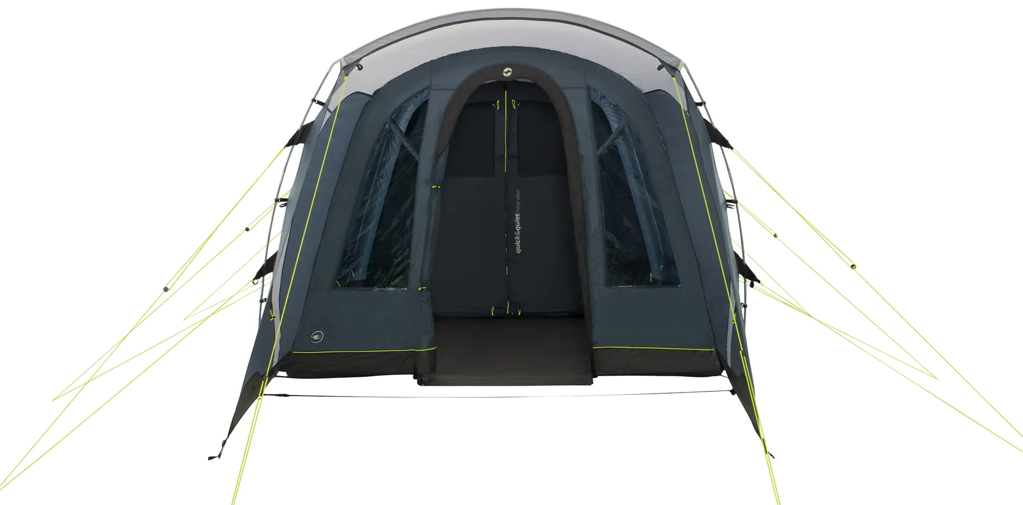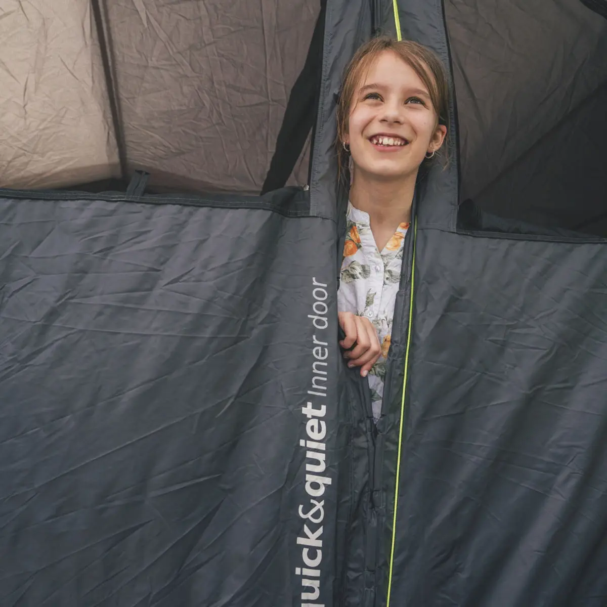 Inflation happens from outside the flysheet through valves positioned where you can reach them easily without crawling inside. The light-toned roof fabric brightens the interior without that gloomy cave feeling some tents create, and side windows in the living area bring in natural light during the day. Ventilation runs through the top sections of front windows and across the rear, plus there's airflow under the deep canopy that works even when rain closes everything else down. The front door uses double zips backed by full mesh, so you can leave it open at night for airflow without inviting midges to join you.