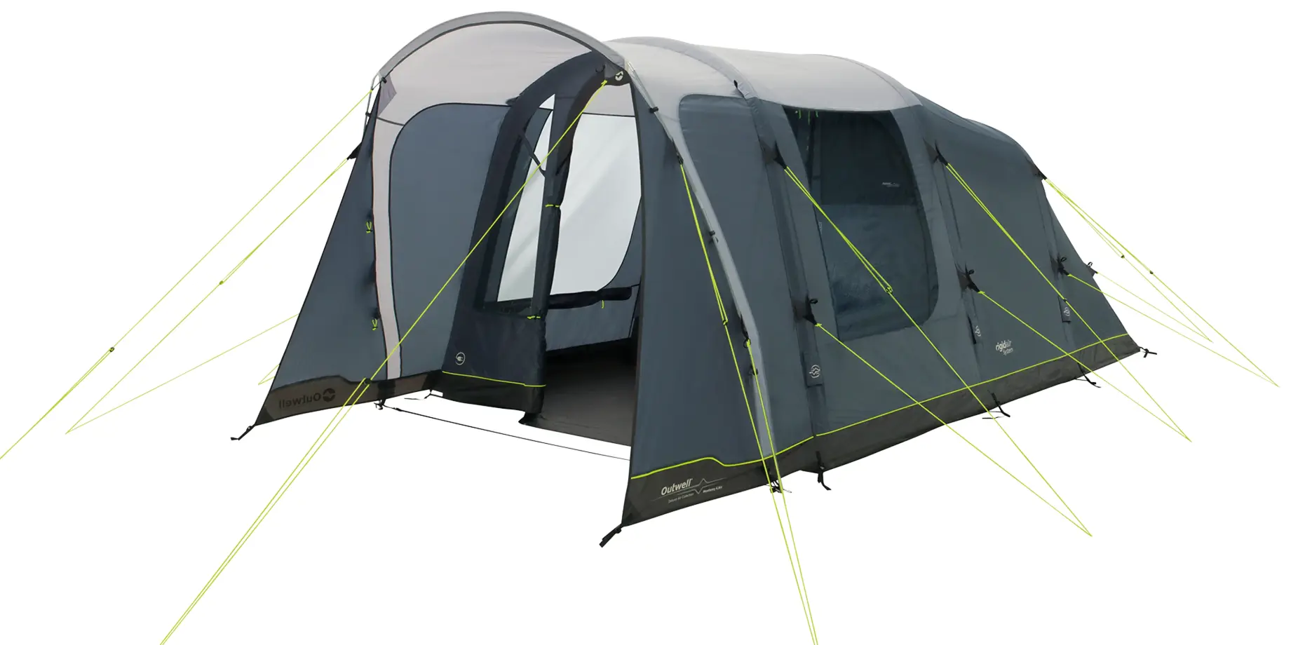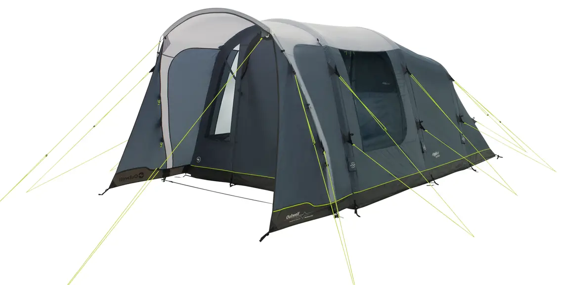 The flysheet uses Outtex 4000 Select polyester rated at 4000mm hydrostatic head with fully taped seams, handling sustained heavy rain without leaking. The sewn-in groundsheet uses double-coated waterproof polyethylene that stops water coming through from below. Outwell applies PFAS-free water repellency treatment. Proper tensioning and guying maintains weather resistance by preventing water pooling on fabric surfaces.