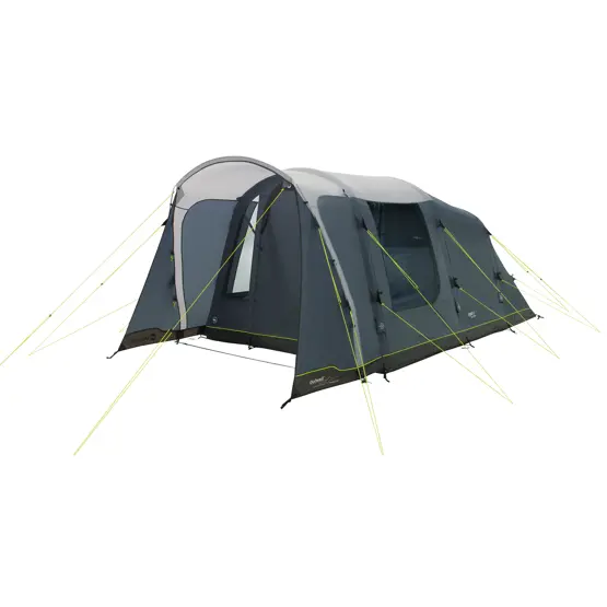 The Outwell Monterey 4 Air pitches in approximately 12 minutes for complete setup including pegging and guying. The pre-shaped DuraAir tubes inflate from valves positioned outside the flysheet, meaning you can get the tent structure up in around 6 minutes before moving belongings inside. This compares to 20-30 minutes for equivalent poled tents.