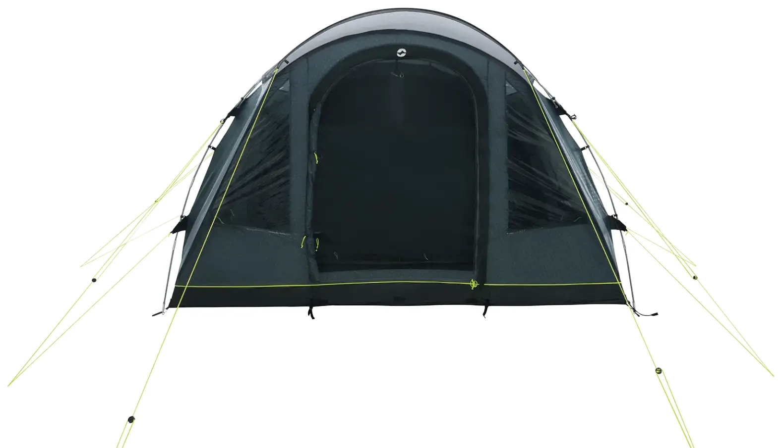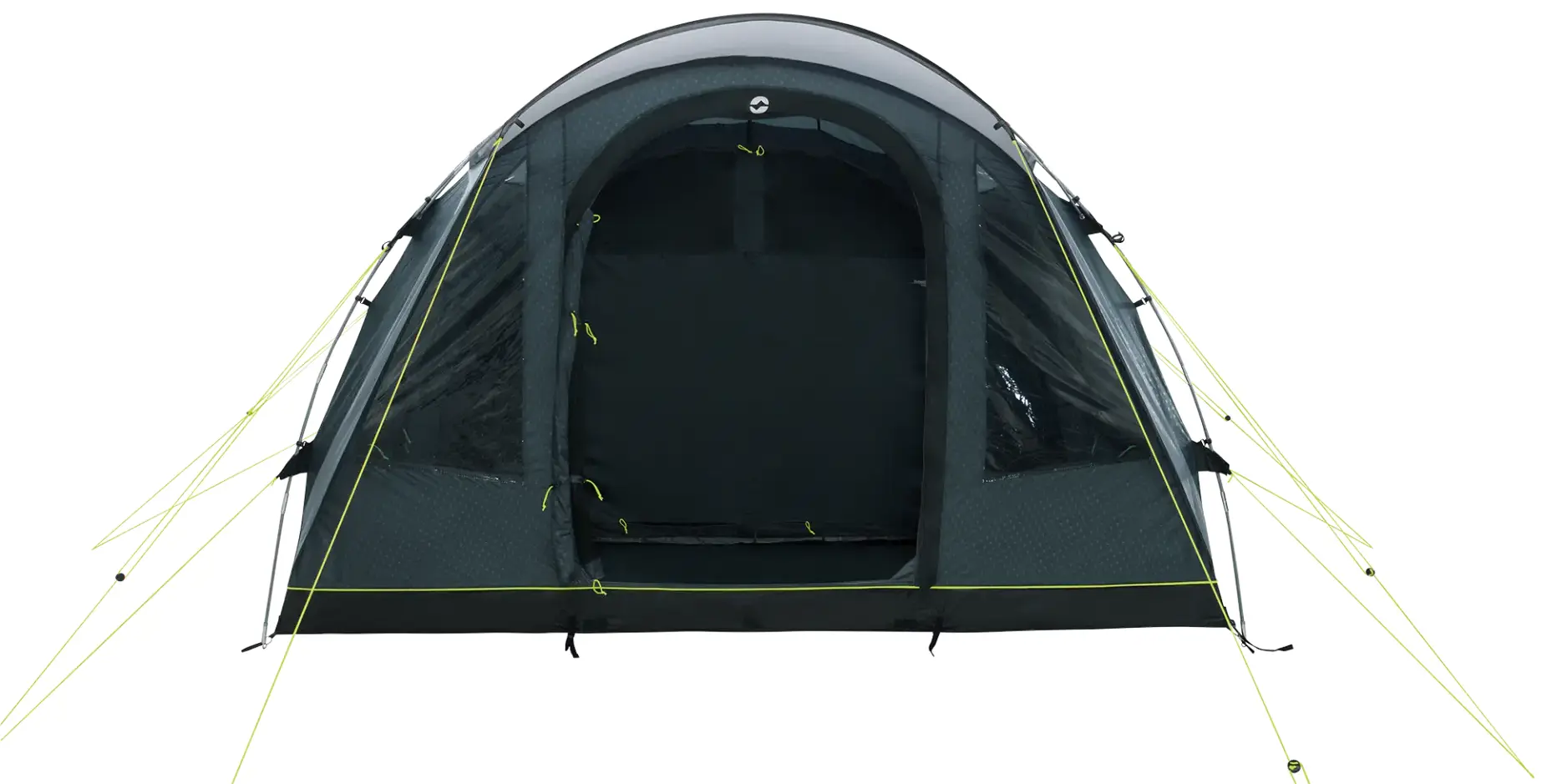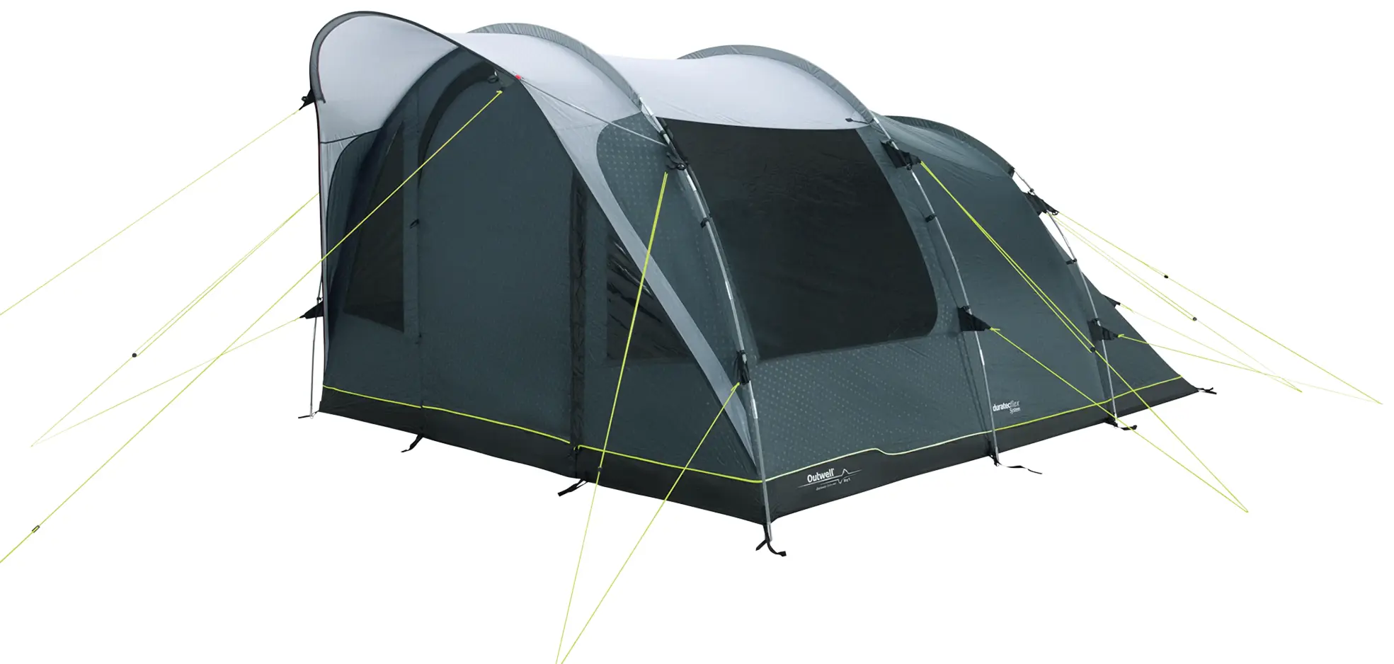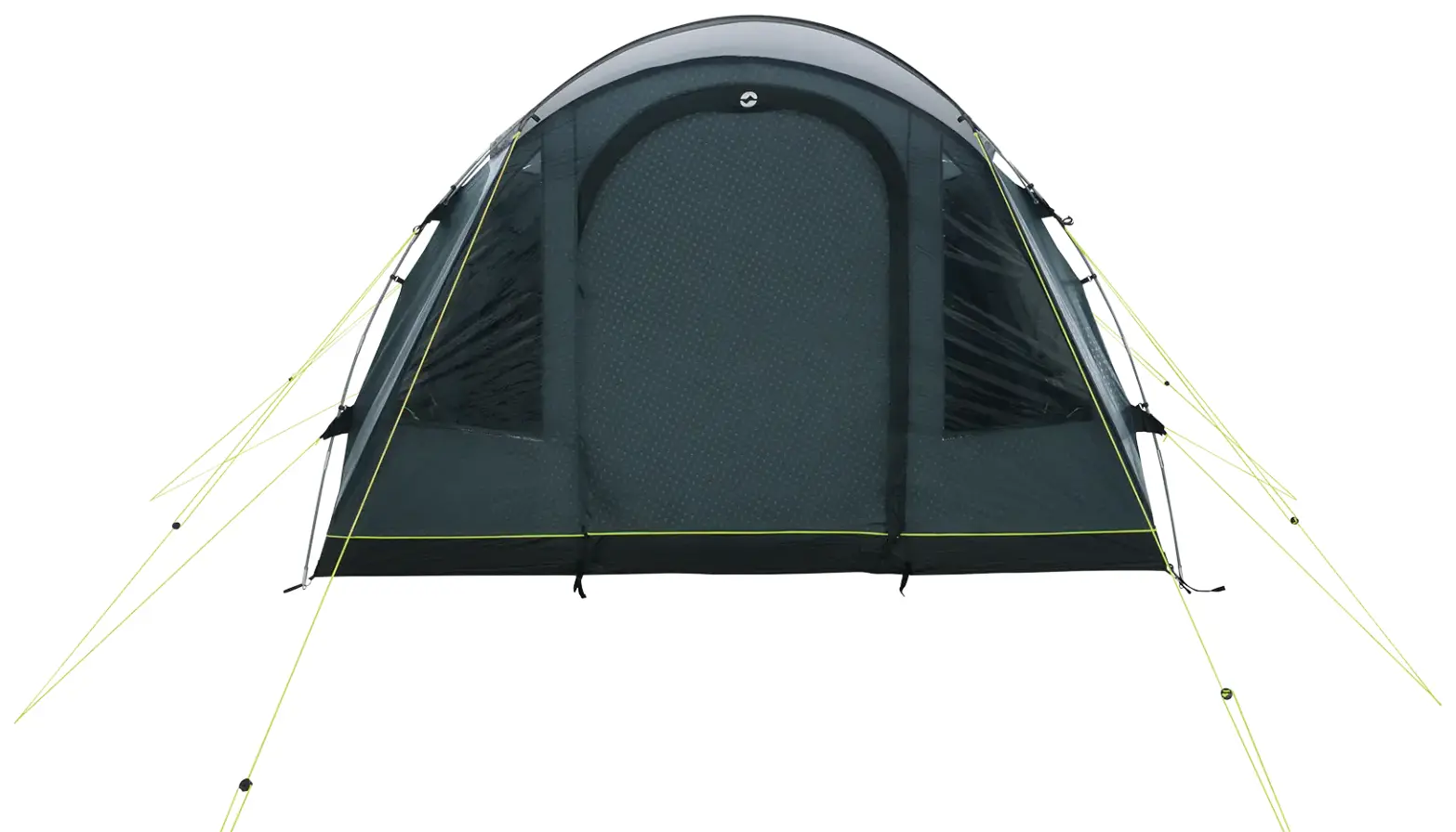 Ventilation comes from multiple points including adjustable rear vents, low-level window vents, and full mesh panels behind both the main J-door and side door. The Outtex 3000 Select flysheet uses PFAS-free water repellency with a 3000mm hydrostatic head, which handles moderate rain without issue but won't match the performance of heavier expedition tents in prolonged downpours. You can pitch flysheet-first in wet weather or as one complete unit when conditions allow, with Outwell claiming seven minutes to get the structure up and 14 minutes for a complete pitch including pegging and guy lines.