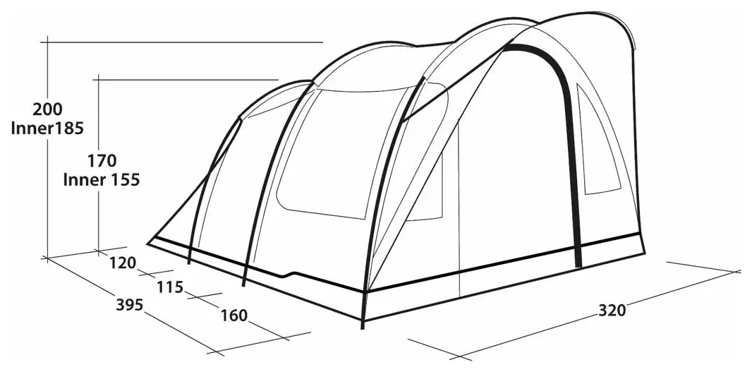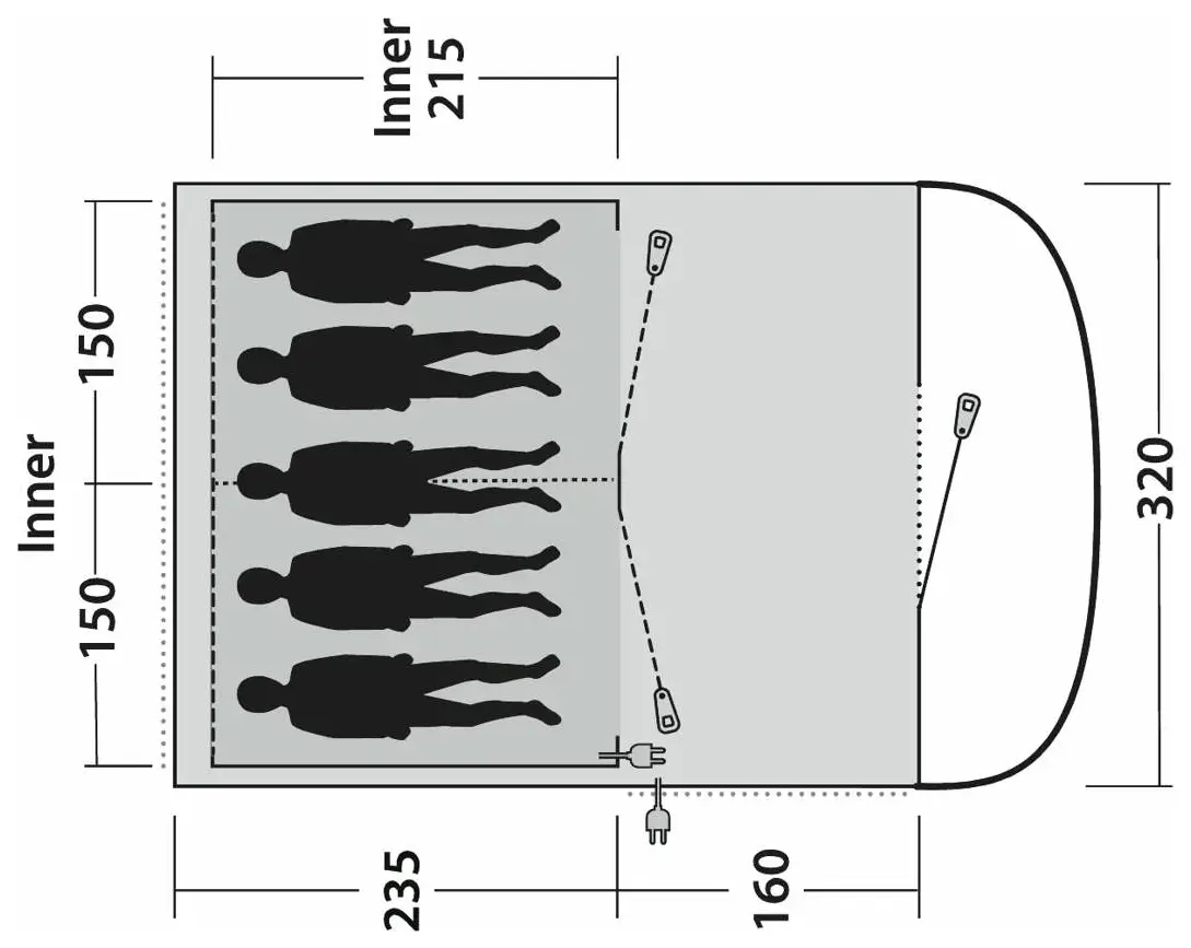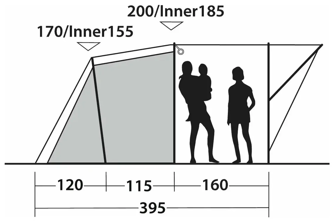 Each Sky 5 bedroom fits two standard single airbeds or sleeping mats placed side by side, with extra floor space for a third compact camping mat if not using full airbeds. Standard single airbeds measuring 185cm x 75cm work well within the bedroom dimensions. Double airbeds fit but leave minimal space for bags or clothing storage. The Premier Bedroom fabric helps reduce condensation on sleeping surfaces compared to standard tent materials.