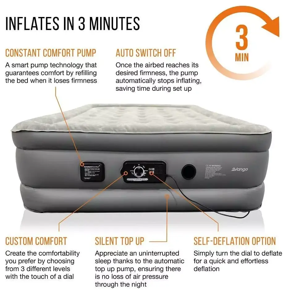 Armed with an auto switch-off feature that prevents over-inflation, the Vango Blissful Double Airbed saves you setup time. The Vango Blissful Double Airbed, with its silent top-up system, designed to detect any loss of air pressure, and perform self-inflation, means you can have a worry free night. The custom comfort setting allows you to adjust the firmness of the bed to your preference simply at the touch of a dial. With a quick three-minute inflation time, repair patches for emergencies, and a carry bag for easy transportation and clean storage make this a first choice for any camper.