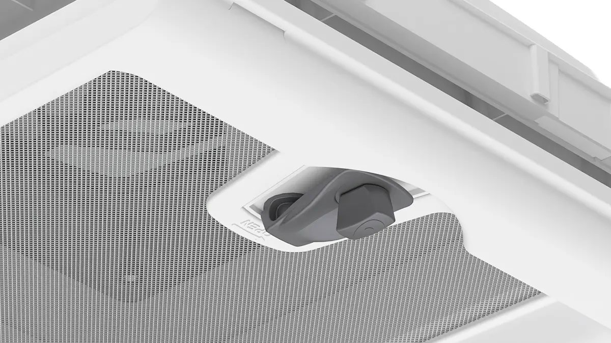 Cut a 280mm square hole in your roof where the vent will sit. Apply sealant like Sikaflex 710, Dekalin 1512 or Therostat II to the underside of the external frame with minimum 10mm width following the rails. Place the external frame in the opening with hinges facing the vehicle front. From inside, position the internal frame and secure using the four supplied screws, tightening evenly to bring the frames together without deforming them. Finally, clip the mosquito net frame into place using the pressure hooks and remove the protective plastic from the lid before use.