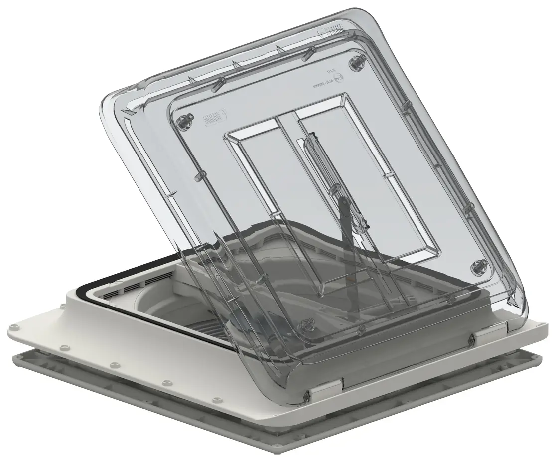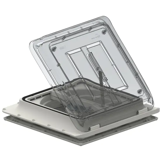 Built from shock and UV-resistant materials, this vent includes double external aluminium mosquito screens preventing debris entry whilst providing permanent passive ventilation even when closed. The aerodynamic design reduces wind noise and vibration during travel. The cover opens and closes manually via a central arm that provides stability against high winds. Installation requires a 39cm square roof opening with the unit secured using 20 self-tapping screws and recommended sealants like Sikalastomer-710 or Dekalin. The system connects directly to your 12V battery supply and requires a 5-amp inline fuse for circuit protection.
