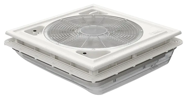 The White cover blocks out sunlight completely, preventing light transmission into your vehicle. The Crystal cover allows natural light to pass through whilst maintaining privacy, as it's translucent rather than transparent. Both versions feature identical ventilation performance with the same 10-blade fan, Polar Control thermostat and 35 cubic metres per minute airflow capacity. The choice between Crystal and White depends on whether you prefer additional natural lighting or complete light blocking in your sleeping or living area.