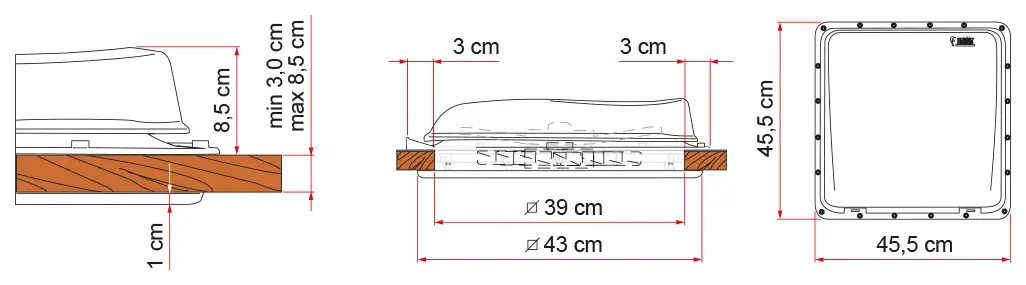 Installation with sandwich technology with screws tightened from inside the vehicle, but it can also be secured from outside. Can be installed on roofs with depths of 3cm to 8.5cm using an optional extension kit, suitable for installation to roof openings of 39 cm to 40 cm squared .