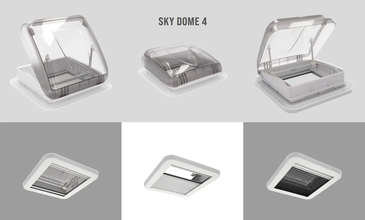The Sky Dome 4 includes dimmable LED lighting integrated into the rooflight frame. The lights connect to your 12V leisure battery system and can be adjusted from full brightness to low ambient lighting. LED technology provides energy-efficient illumination whilst drawing minimal power from your battery compared to traditional halogen lights. The lights remain functional independently of whether the rooflight is open or closed.