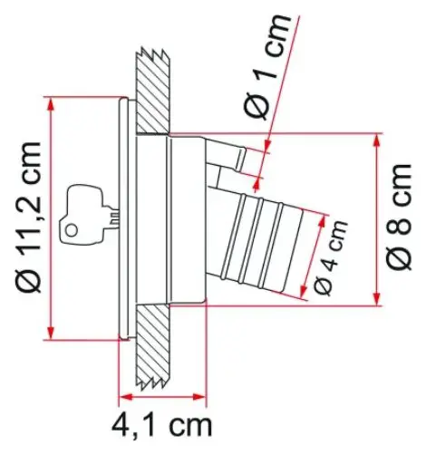 The Fiamma Water Filler Cap connects to a water tank via a 40mm internal diameter flexible hose. It mounts to a flat or near-flat external surface using three screws and seals with a foam washer. The outer rim diameter is 110mm, and the overall face diameter is 83mm. It suits new builds and retrofits alike, and fits Fiamma's own fresh water tanks as well as third-party installations.