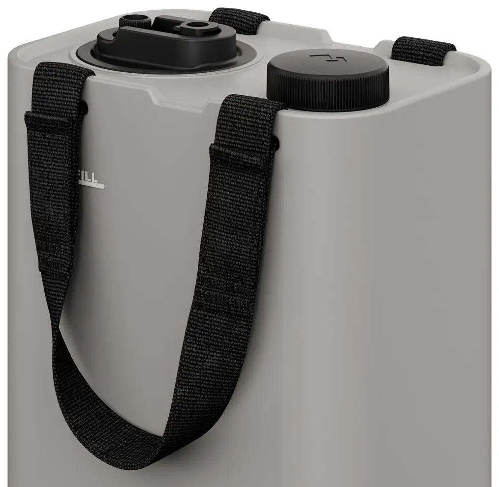 The Dometic GO Water Jug weighs just 1.75kg when empty. When filled to its 11-litre capacity, the total weight is approximately 12.75kg. The comfortable removable webbed carry handles are designed to distribute this weight brilliantly, making it manageable to transport from your vehicle to your pitch even when full.